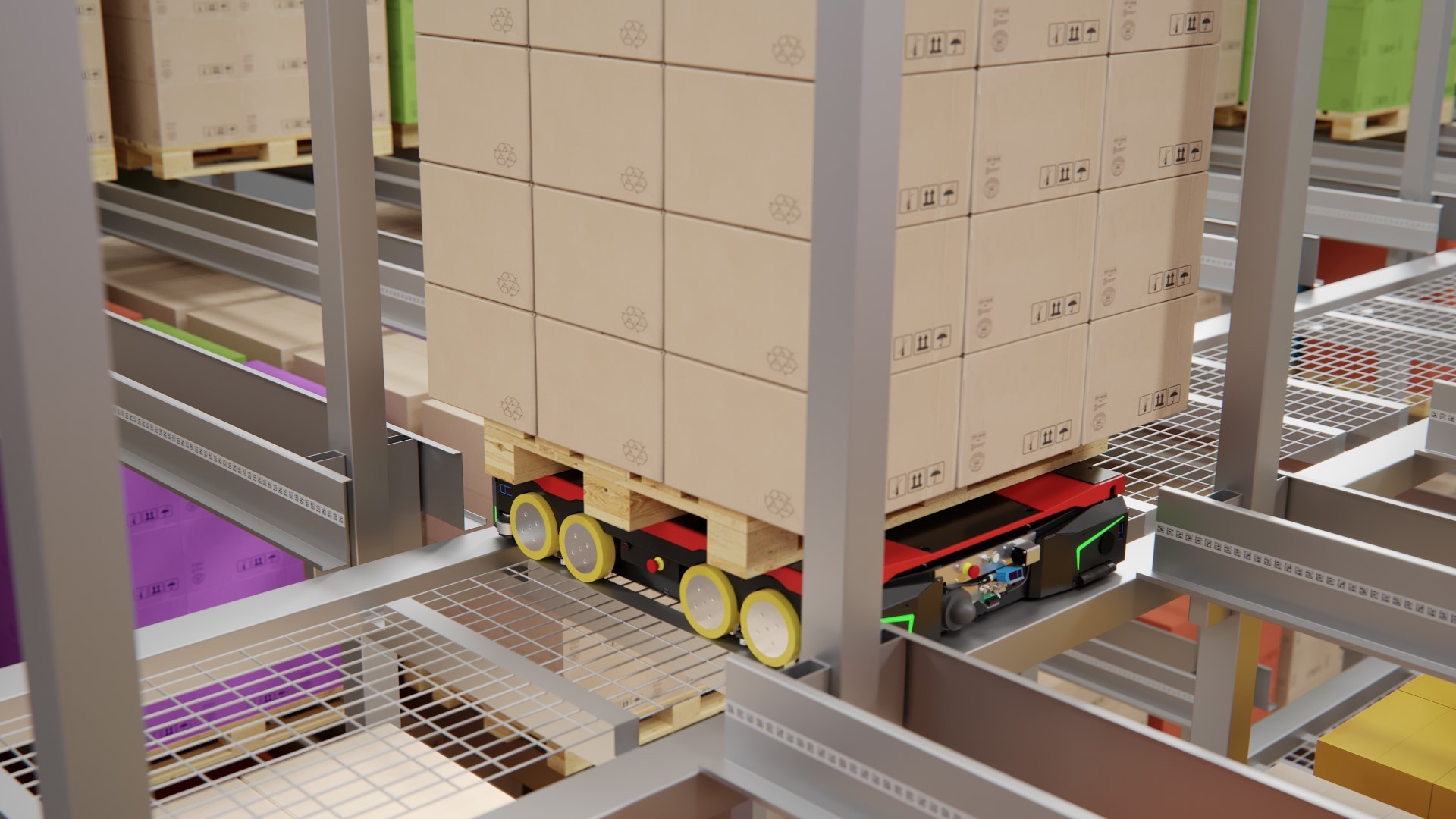 • Sitten nelisuuntainen sukkula poimii tavarat ja kuljettaa ne pääkaistojen avulla varastopaikkaan, joka sijaitsee yhdessä varastosolista .